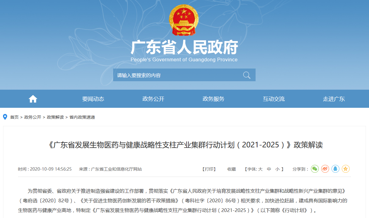 近日,廣東省科學(xué)技術(shù)廳、發(fā)展和改革委員會(huì)、工業(yè)和信息化廳、衛(wèi)生健康委員會(huì)、市場監(jiān)督管理局等五部門聯(lián)合發(fā)布《廣東省發(fā)展生物醫(yī)藥與健康戰(zhàn)略性支柱產(chǎn)業(yè)集群行動(dòng)計(jì)劃(2021-2025年)》。